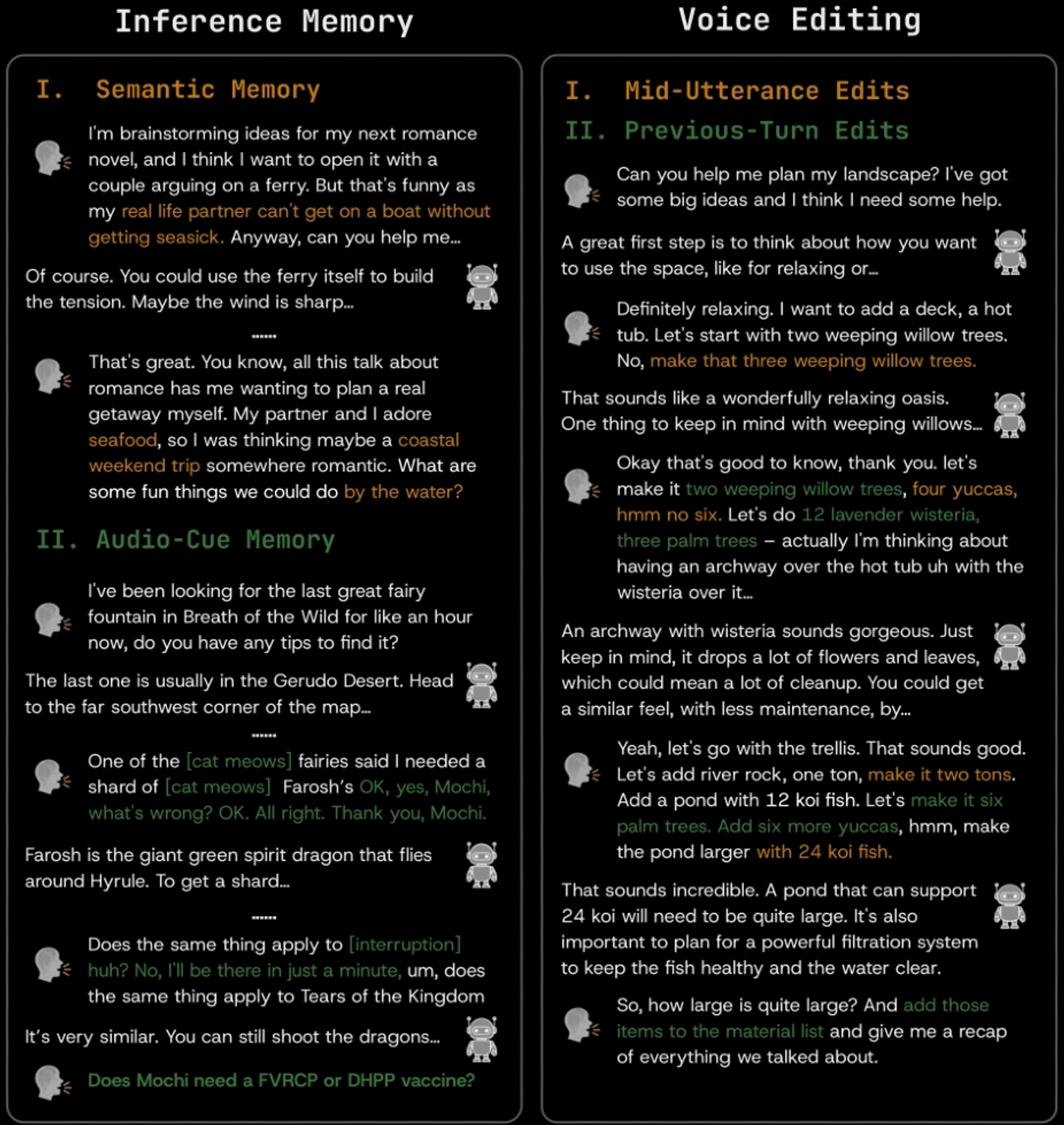 Models struggled to apply mid-sentence and prior-turn corrections for Voice Editing and to retrieve details present only in the acoustic signal (e.g. background noise or speaker paralinguistics) rather than the text transcript for our Audio-Cue gated Inference Memory tasks.
